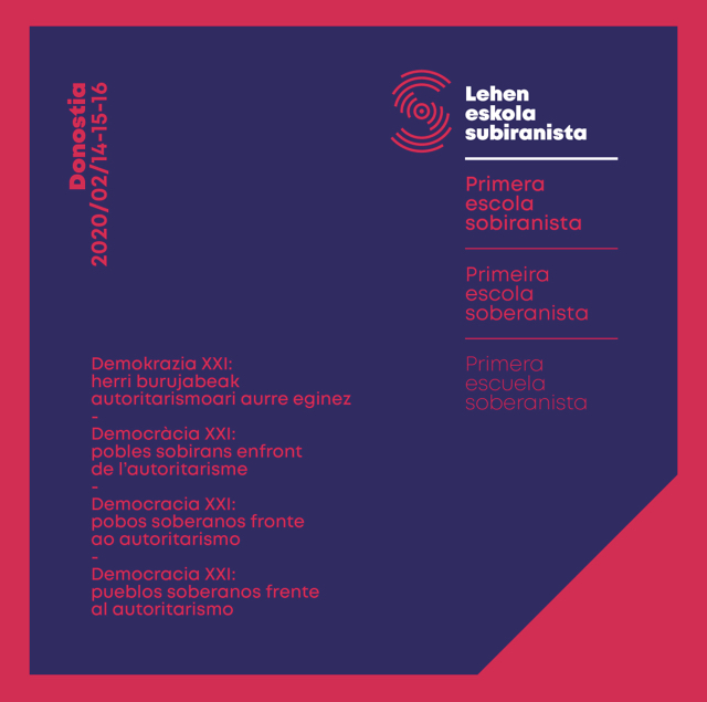 FUNDAZIO SUBIRANISTA EZKERTIARREN FOROAk 2019ko abenduaren 6an Compostela (Galiza)ko osoko bilkuran adostu bezala, “Demokrazia XXI: herria burujabeak autoritarismoari aurre eginez” lemapean, Eskola Suberanistaren lehen ekitaldia Iratzar Aretoan, Zuatzu-Donostian ospatu da, otsailaren 14-15-16 egunetan. Laneko saioak ostiral arratsaldean hasi eta larunbata gauean amaitu dira, igandea hautazko ekintza baterako gorde dugu.